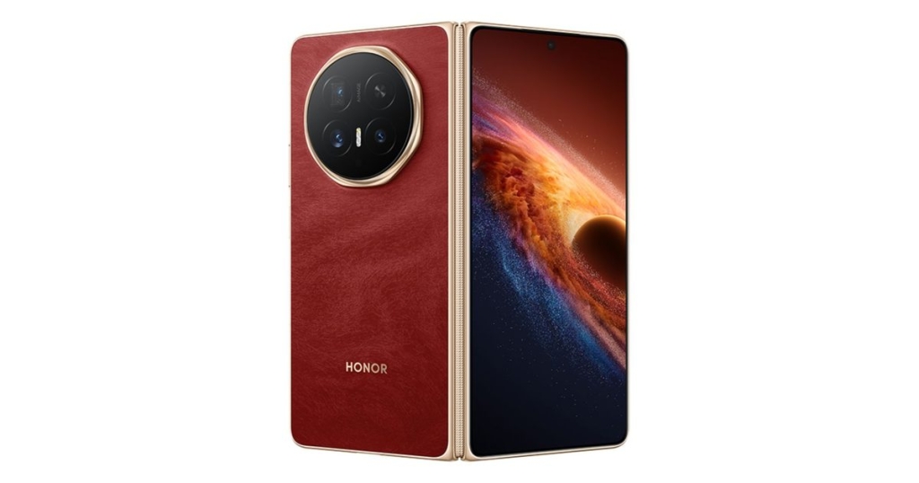 The Magic V6 also debuts in a striking red colorway with a textured back panel and a gold metallic frame. The design features a more refined camera island, a flat outer display with a centered hole-punch cutout, and an inner screen with a hole-punch camera positioned on the right side. This premium look, combined with its durability, makes the Magic V6 a standout in the foldable market.