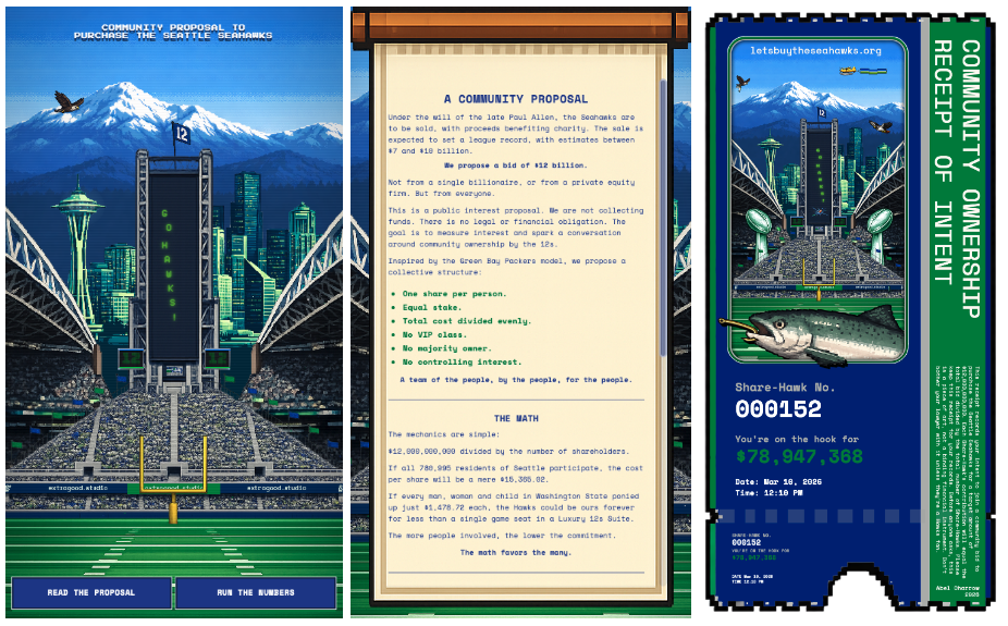 The initiative, cheekily titled “Let’s Buy the Seahawks,” isn’t your average grassroots fundraising effort. It’s a clever, community-driven art project that uses humor, tech, and a dash of Seattle pride to question the billionaire-dominated world of professional sports ownership.